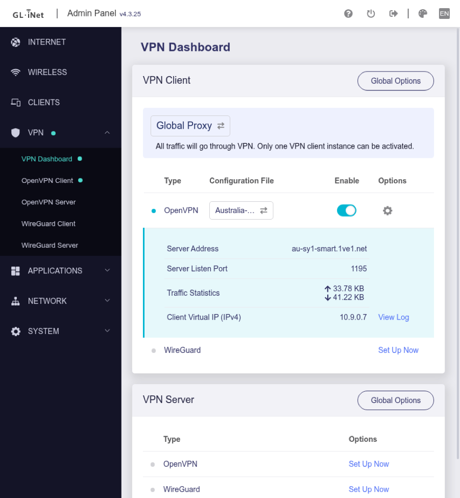 8. Navigate back to the VPN Dashboard and enable the OpenVPN client